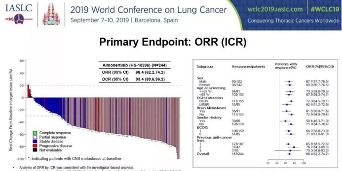 在2019年WCLC大会上公布的阿美替尼II期研究结果显示,纳入来自中国大陆36个地区(189名患者)和中国台湾(55名患者)的244例患者。结果显示,阿美替尼二线治疗EGFR T790M阳性晚期NSCLC的ICR(独立评审委员会)评估ORR(客观缓解率)为68.4%,DCR(疾病控制率)为93.4%。