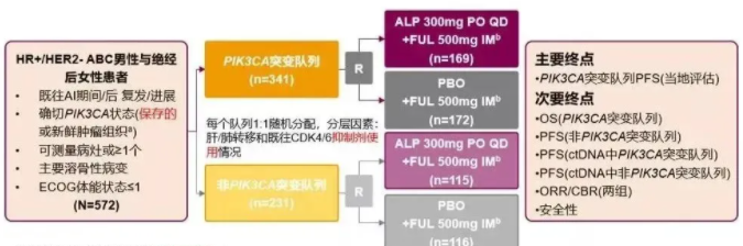 SOLAR-1是一项随机、双盲、安慰剂对照的3期试验,共纳入572例HR阳性、HER2阴性的晚期乳腺癌患者,这些患者在内分泌治疗期间或之后发生疾病进展。根据肿瘤组织的PIK3CA基因突变状态将患者分为两个队列,两个队列的患者均按照1:1随机接受Alpelisib联合氟维司群,或者安慰剂加氟维司群。