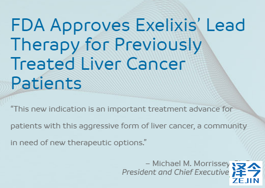 2019年1月14日,Exelixis公司宣布,美国食品和药物管理局(FDA)批准CABOMETYX®(卡博替尼,cabozantinib)片剂用于先前接受过索拉非尼治疗的肝细胞癌(HCC)患者。