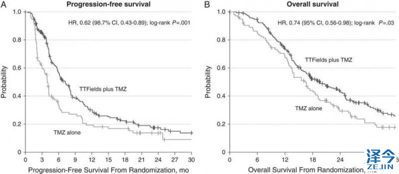 其中,生存率对比数据为,2年43%比31%;3年26%比16%;5年13%比5%,可以看到,电场疗法+替莫唑胺的联合疗法对胶质瘤患者的长期生存意义重大,生存率提高了3倍!