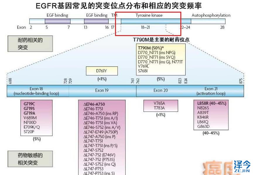 如上图所示,EGFR基因的大家族一共由28个外显子构成。通常会发生突变导致癌症的位点集中在红框内的18-21外显子。