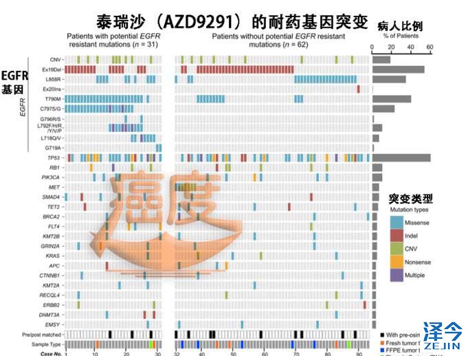 究其原因,是因为泰瑞沙耐药的原因非常复杂,耐药后患者发生C797S突变和cMET扩增的概率分别为7?15?右,而且这两类突变的占比竟然还是最高的,其他的耐药基因突变比例都是1?2?非常的零散。不像是一代药物耐药后,有50?概率存在T790M。所以说很难有一个所谓第四代药物,解决大部分患者泰瑞沙耐药的问题。