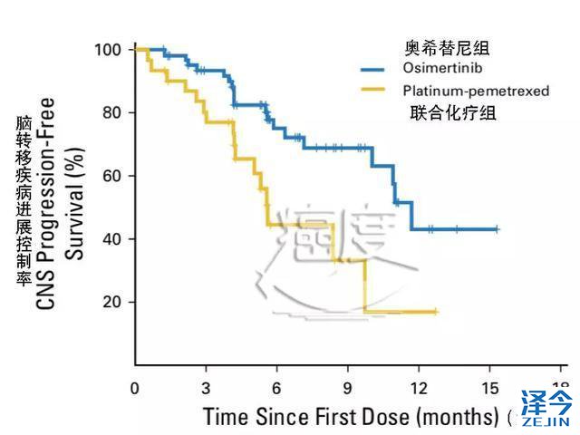 使用奥希替尼AZD9291的中位无进展生存期为11.7个月,而联合化疗组为5.6个月。患者在6个月和12个月的脑转移灶没有发生进展的比例分别为75%和43%,联合化疗组对应的数据分别是45%和17%(图3)。