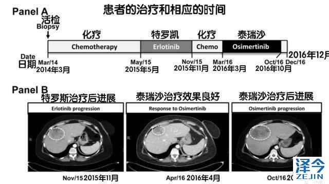 2015年11月,特罗凯治疗6个月之后病情进展,脑、骨和肝脏出现新的转移灶,对肝部病灶的穿刺活检发现有EGFR基因的T790M突变。