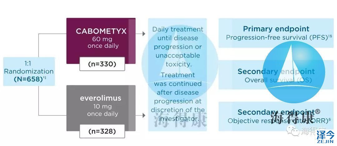 患者(N=658)被随机分为两组,一组给予每日60 mg口服的卡博替尼 (N=330),另一组给予每日10 mg口服的依维莫司(N=328)。患者多为男性(75%),中位年龄62岁。69%的患者以前只接受过一次抗血管生成治疗。MSKCC危险组患者分布为46%有利(0危险因素),42%中等(1危险因素),13%不良(2或3危险因素)。54%的患者有3个或3个以上的器官有转移性疾病,包括肺(63%)、淋巴结(62%)、肝脏(29%)和骨骼(22%)