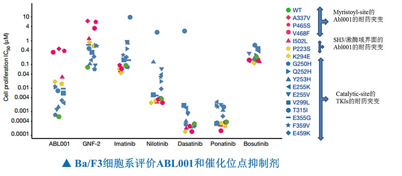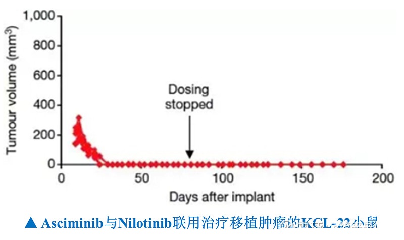去年美国血液学年会会议显示ABL001单用疗效跟竞争性激酶抑制剂类似,它的耐药性产生的也比较快,但是,ABL001联用ATP竞争抑制剂的临床前数据非常令人振奋,表现出非常强大的治愈潜力。为此,诺华开了多个与ATP竞争性ABL激酶抑制剂联用的临床治疗方案,包括伊马替尼、尼洛替尼、达沙替尼