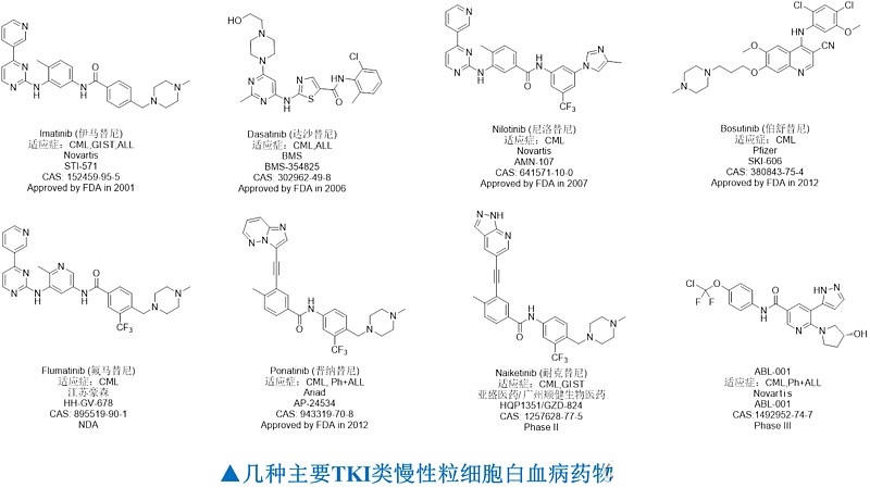 值得一提的是,氟马替尼和耐克替尼分别为我国豪森药业和亚盛药业研发的具有自主知识产权的二代和三代TKI,目前均已处于III期临床研究,上市指日可待。