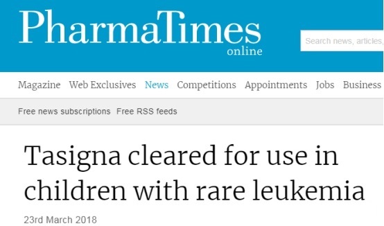2017年,美国FDA批准用于治疗新确诊的Ph+ CML-CP成人患者的治疗;2018年被美国FDA批准用于新确诊的Ph + CML-CP的1岁或1岁以上的患者;Tasigna还可用于治疗1岁或1岁以上对酪氨酸激酶抑制剂(Tki)不耐药的Ph+ CML-CP儿童患者以及用于对伊马替尼治疗耐药或不耐受成人慢性期和加速期慢性粒细胞白血病患者的治疗。