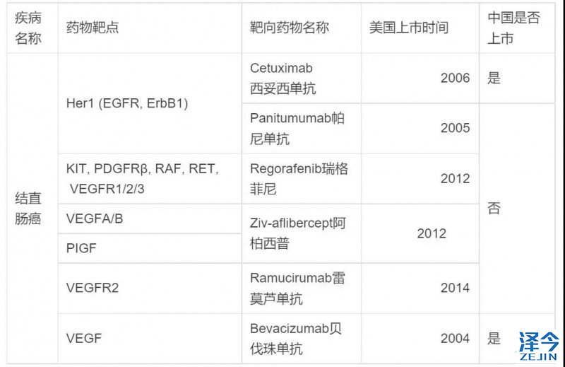 结直肠癌的靶向药比胃癌的多一点,共有六种,详见下表。