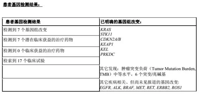 手术后 ,贾先生又做了放化疗辅助治疗,病情控制较稳定。不幸的是,2016年10月,贾先生出现了脑转移,放化疗后仍有很大复发转移的风险,为寻求下一步治疗方案,贾先生接受了美国foundation one 全基因检测,检测结果让贾先生大吃一惊:美国的基因检测竟然找到7个基因组突变,同时给出了7种临床可能受益的靶向药物,并推荐了美国14个针对贾先生自身病情的药物临床试验,这让曾经做过基因检测,因为结果为阴性,而一直认为自己除了放化疗别无选择的贾先生惊喜万分,原来自己还有这么多可以选择的治疗方案。目前,贾先生已经请国内肿瘤专家会诊,根据基因检测报告制定了下一步治疗方案,希望贾先生能早日康复。