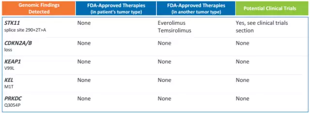 本次基因检测,找到了FDA批准的针对该患者的疗法,并且找到了针对其他类型肿瘤,但癌症患者有可能潜在获益的疗法,找到了相关的临床试验及病情类似的患者。