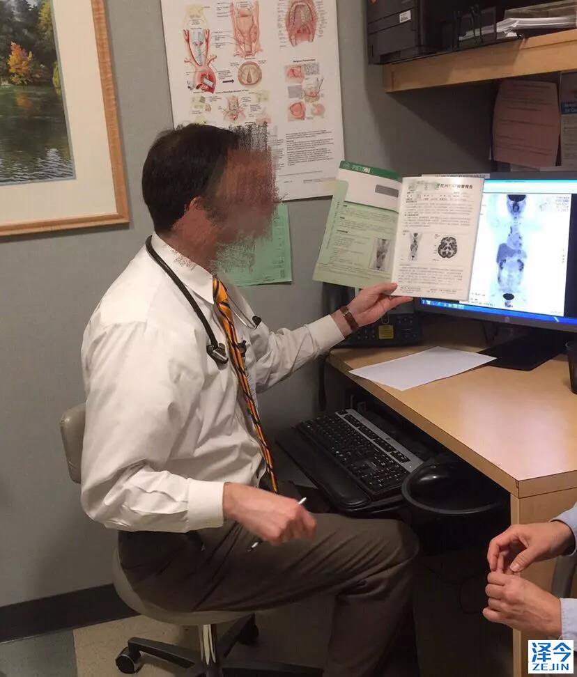 这是我的美国医生Dr.T,他的来头不小,是美国非小细胞肺癌治疗指南的制定者之一,工作人员介绍,他每年会接诊上百位来自中国的肺癌患者。Dr.T很热情耐心,他详细了解了我的病情,和我足足谈了一个多小时,问到我没有问题为止。