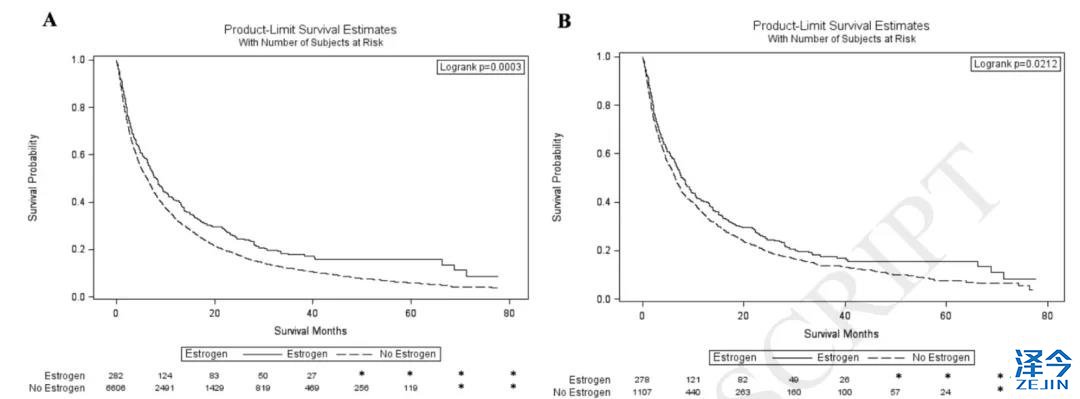 Kaplan-Meier分析发现,使用雌激素组患者的中位总生存期是8.2个月,长于没有使用雌激素组的6.2个月。
