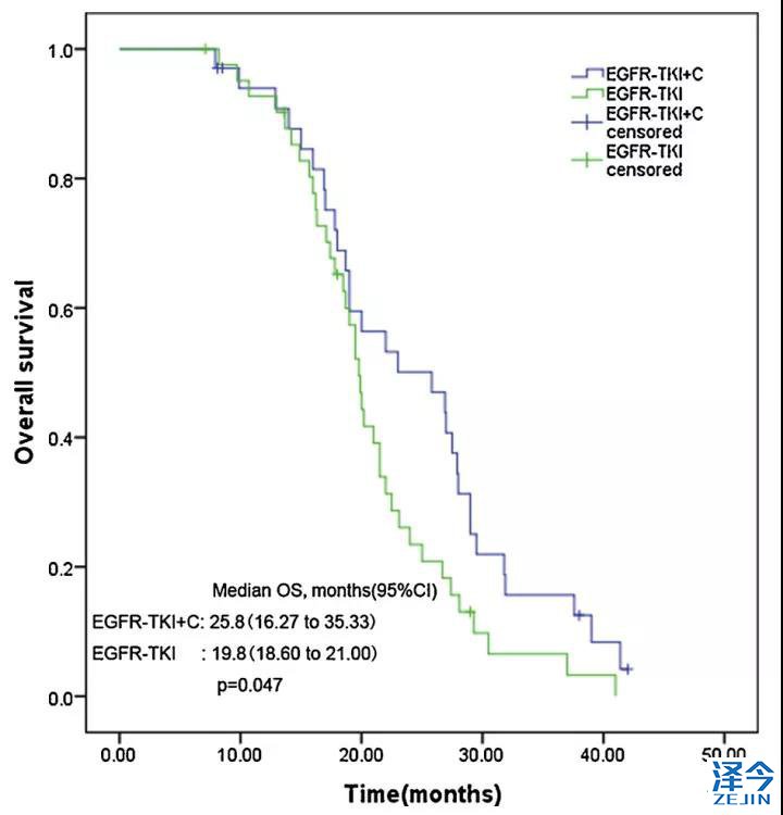 研究人员将76名EGFR突变丰度低的晚期非小细胞肺癌患者(其中25名为19外显子突变,52名为21外显子突变)分为两组。一组是联合治疗组,一组是靶向单药治疗组。联合治疗组患者在化疗结束后,每日继续使用EGFR靶向药。单药治疗组只接受EGFR靶向治疗。
