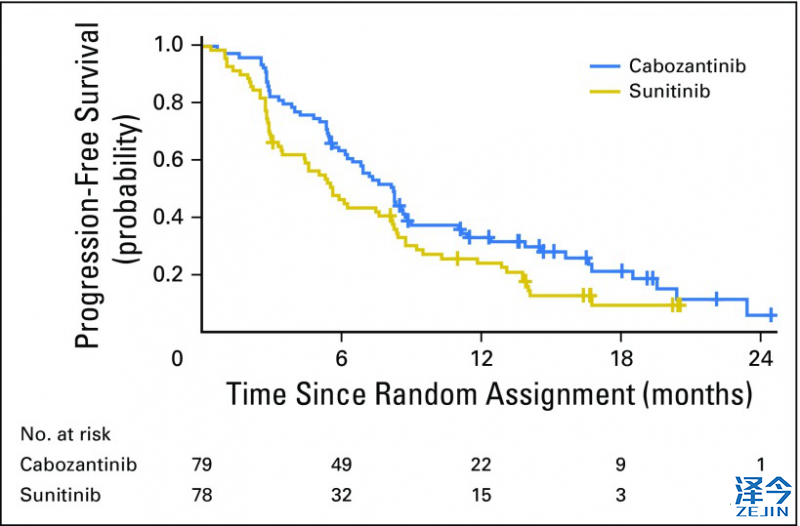 临床设计:招募157位晚期初诊的肾癌患者,一线使用184(79人)或者舒尼替尼(78人)。184剂量每天60mg;舒尼替尼剂量每天50mg,用药4周,停药2周。