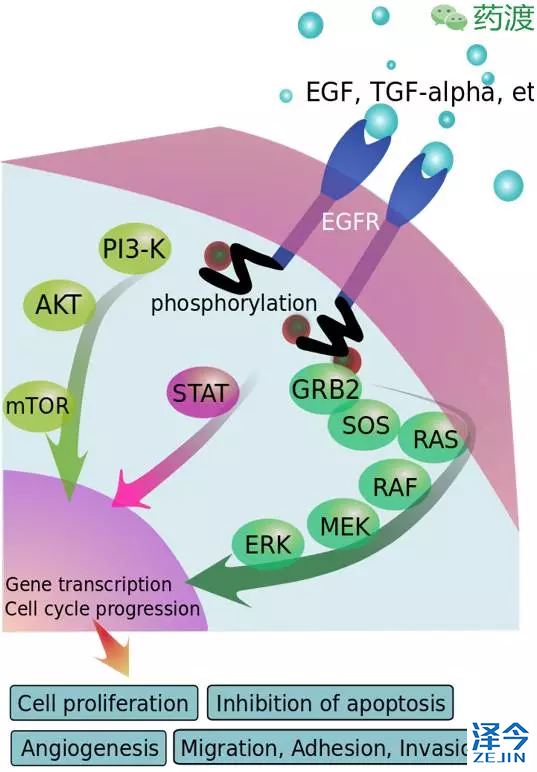 EGFR蛋白是一个跨膜蛋白,细胞膜外无络氨酸激酶活性的EGFR单体,负责与配体结合,在没有配体的情况下,细胞膜表面EGFR单体会被持续地内呑到细胞里面,当EGFR单体过量时,2个EGFR单体分子,就会在没有配体的条件下,自行聚合成一个二聚体。而且这个EGFR二聚体会自我激活,并进一步激活下游的细胞信号通路。在有配体的情况下,两个带有配体的EGFR单体相互结合形成有激酶活性的二聚体,二聚体的磷酸激酶把EGFR二聚体自身给磷酸化,磷酸化的残基是募集适配蛋白和额外的酪氨酸激酶底物的结合位点,加强了酪氨酸激酶活性,把下游信号通路当中的蛋白磷酸化,激活下游的信号通路,包括MPAK,Akt和JNK通路, 诱导细胞增殖。EGFR还可能和ErbB受体家族的其他成员(ErbB2/Her2/neu)聚合来激活。
