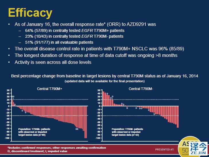 总体来说,51%患者的肿瘤缩小,在确认T790M突变的89名患者中,64%的患者对AZD9291有反应,T790M阴性患者为23%。在数据截止期,几乎所有患者仍持续有反应,最长持续8个多月。仍需要更长期的随访去确认这种治疗是否会延长总生存期。鉴于目前的数据表明AZD9291在T790M突变患者中效果更好,将来对于此药的研究可能限定在这个亚组人群中。