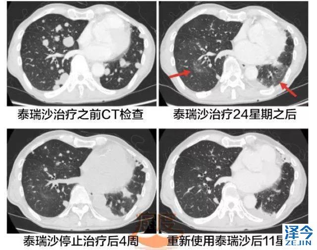 一般来说,医生倾向于在出现肺毛玻璃阴影(GGO)的时候停止泰瑞沙,这是符合情理的,毕竟如果是致命性的间质性肺炎(ILD)就非常危险了,但是靶向药物停止了,癌细胞可不会停,下一步怎么办?这是一个不能回避的问题。