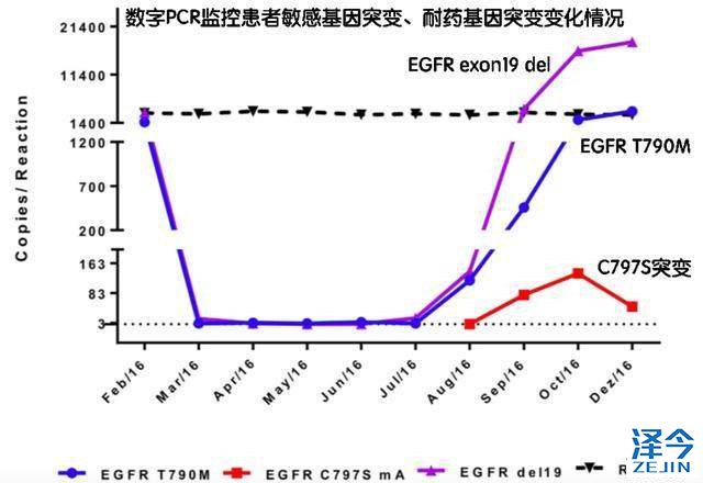 2016年3月,停用特罗凯,开始使用泰瑞沙进行治疗。在使用泰瑞沙期间每个月抽血,使用数字PCR的方式检测肿瘤基因突变的变化情况。