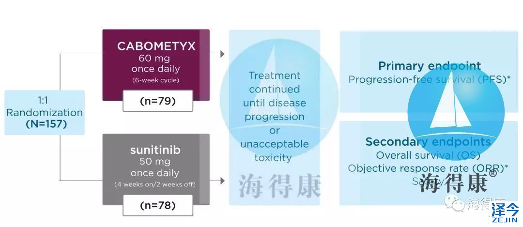 CABOSUN (NCT01835158)是一项随机(1:1)、开放标签、多中心的研究,对未接受过早期治疗的晚期肾细胞癌患者进行CABOMETYX与舒尼替尼的比较。患者随机接受CABOMETYX (N=79) 60 mg /日口服或舒尼替尼(N=78) 50 mg /日口服(治疗4周后休息2周),直至病情进展或毒性无法接受。根据国际转移性肾细胞癌数据库联盟(IMDC)风险组的定义,所有患者必须患有中度或低风险疾病。患者按IMDC危险组及有无骨转移进行分层