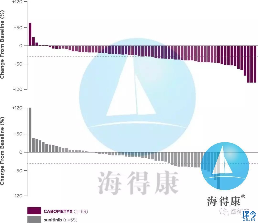 80%使用卡博替尼的患者出现肿瘤缩小,而使用舒尼替尼后肿瘤缩小的患者比率50%