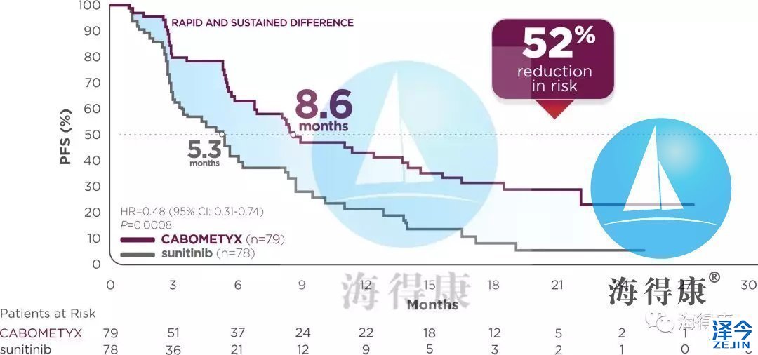 卡博替尼显示中位PFS较舒尼替尼有显著统计学意义的改善,降低52%疾病进展的风险