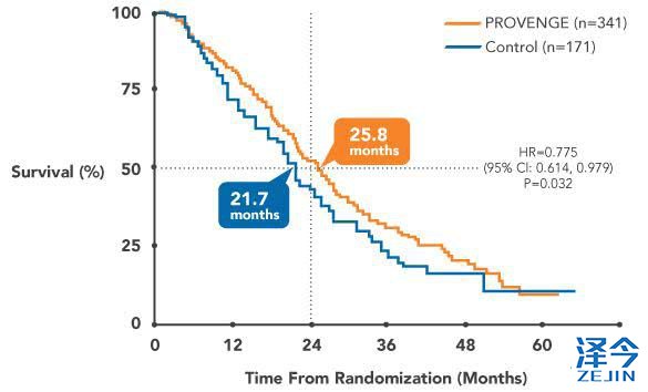 上图来源于普列威临床实验的结果,我们可以很直观地看出普列威带来的额外疗效。接受常规治疗的病人平均存活时间为21.7个月,接受普列威治疗的病人平均存活时间为25.8个月;但是到了第60个月,接受普列威治疗的病人存活率并不高于接受常规治疗的病人。