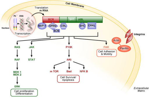 在患者服用普纳替尼前,都会了解ABL1基因等知识,下面泽今健康小篇简单介绍有关知识。ABL1基因所编码的蛋白存在于细胞核与细胞质中,属于酪氨酸激酶,主要参与细胞的分化、分裂与应激反应等,ABL1蛋白的SH3结构域对该蛋白起着负调控作用,SH3结构域的缺失会使ABL1成为原癌基因,ABL1蛋白将持续激活导致细胞发生癌变。在肿瘤细胞中发现ABL1基因与其它多种基因发生融合,最常见的为t(9;22)染色体易位,导致BCR(breakpoint cluster region)与ABL1基因的融合,9号与22号染色体易位产生变异的染色体也叫费城染色体( Philadelphia chromosome,Ph),这种类型的融合基因常见于慢性髓细胞白血病。