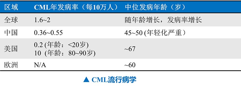 慢性髓性白血病(CML,常称为慢性粒细胞性白血病)是骨髓造血干细胞克隆性增殖形成的恶性肿瘤。根据中国慢性髓性白血病诊断与治疗指南(2016年版)和成人慢性粒细胞白血病诊疗规范(2018年版),慢性髓性白血病(CML)占成人白血病的15%,全球年发病率为1.6~2/10万。患者的发病机制为费城染色体(Ph)基因变异产生BCR-ABL融合基因,从而编码产生BCR-ABL融合蛋白。BCR-ABL融合蛋白异常的高酪氨酸激酶活性导致自身酪氨酸残基及许多底物蛋白磷酸化,激活多条信号通路,导致细胞白血病化。Bcr-Abl融合基因存在于95%的慢性髓细胞白血病(CML),20%-30%的成人急性淋巴细胞白血病(ALL)和2%-5%的儿童ALL患者中。