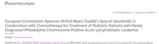 2018年,欧洲药品管理局批准Sprycel(dasatinib,达沙替尼)联合化疗,用于新确诊的费城染色体阳性急性淋巴细胞白血病(Ph+ALL)儿科患者的治疗,此次批准使Sprycel成为唯一一种拥有剂型可用于儿科患者和不能吞咽片剂患者的酪氨酸激酶抑制剂。