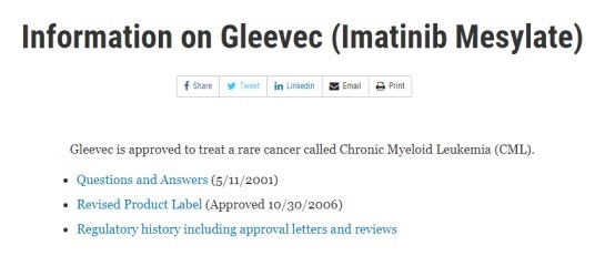 Glivec于2001年获美国FDA、欧盟CHMP批准用于治疗晚期费城染色体阳性的慢性粒细胞性白血病(CML);2002年在中国上市;2003年3月,FDA批准Glivec用于CML的一线治疗;2003年5月,FDA批准Glivec治疗Ph染色体阳性的儿童CML患者。目前Glivec已成为慢性粒细胞白血病的一线治疗药物。