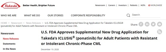 2020年12月18日,美国食品和药物管理局(FDA)已批准Iclusig(ponatinib,普纳替尼)的补充新药申请(sNDA),用于治疗对至少2种激酶抑制剂有耐药性或不耐受的慢性期(CP)慢性粒细胞白血病(CML)成人患者。此次批准证实,慢性期慢性粒细胞白血病(CP-CML)仍可在第三代TKI中获益,这对于慢性期慢性粒细胞白血病患者的后续治疗十分关键。