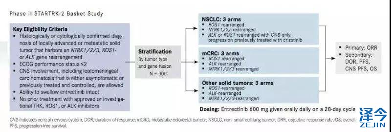 第二阶段多中心STARTRK-2篮式试验(NCT02568267)根据患者的肿瘤类型和基因融合对患者进行分层。在2项I期临床试验中,研究人员检测了entrectinib的安全性和有效性,并证实了在多种肿瘤类型中的强大活性。试验表明,该药物耐受性良好,一般不良事件(AE)可逆、可控。