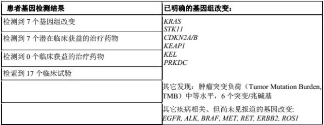 手术后 ,贾先生又做了放化疗辅助治疗,病情控制较稳定。不幸的是,2016年10月,贾先生出现了脑转移,放化疗后仍有很大复发转移的风险,为寻求下一步治疗方案,贾先生接受了美国foundation one 全基因检测,检测结果让贾先生大吃一惊:美国的基因检测竟然找到7个基因组突变,同时给出了7种临床可能受益的靶向药物,并推荐了美国14个针对贾先生自身病情的药物临床试验,这让曾经做过基因检测,因为结果为阴性,而一直认为自己除了放化疗别无选择的贾先生惊喜万分,原来自己还有这么多可以选择的治疗方案。目前,贾先生已经请国内肿瘤专家会诊,根据基因检测报告制定了下一步治疗方案,希望贾先生能早日康复。