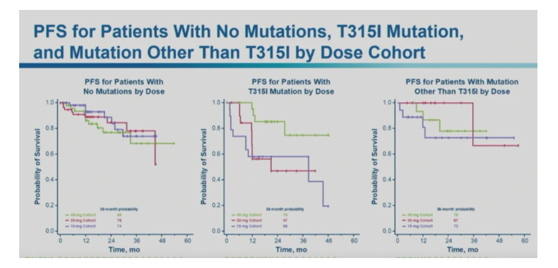 无论突变状态如何,接受普纳替尼治疗的患者均表现出良好的生存结果。伴有T315I突变的患者在给药剂量45mg15mg时,患者的无进展生存期(PFS)显著优于其他组。除T315I突变外,其他基因突变的患者也实现了长期PFS和总生存期(OS)。