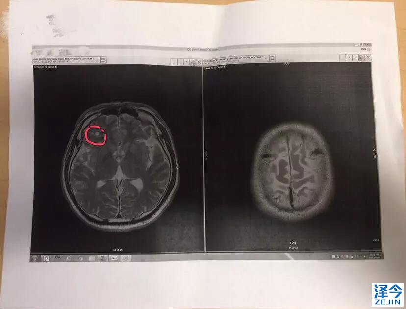 在更高清的影像报告下,我出现了喜忧参半的结果,喜的是脖子以下的肿瘤明显缩小,这说明克唑替尼有效;忧的是,脑部新发现了一个国内没有检查到的2mm亮点结节。